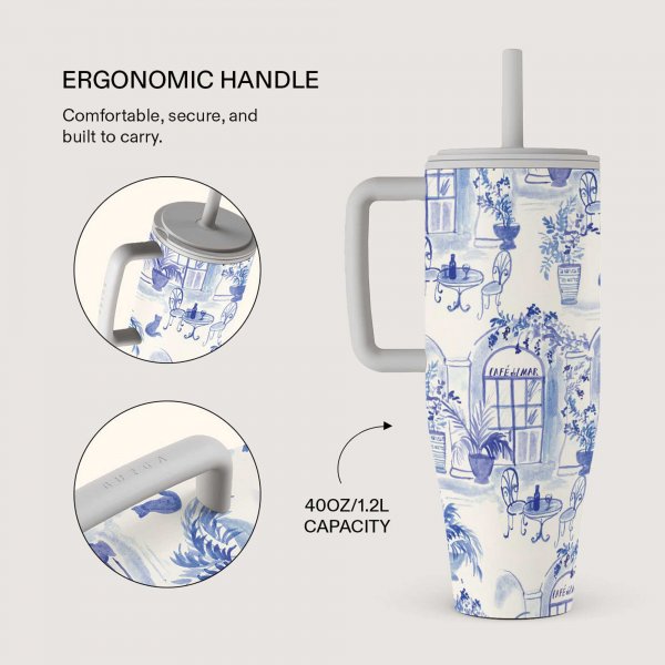 Denna 40 oz/1,2 l mugg håller din dryck rykande varm i 12 timmar eller iskall hela dagen, samtidigt som den skyddar din väska från spill med ett läckagesäkert lock och ett sugrör som låser på riktigt. Den glider smidigt in i bilens mugghållare, erbjuder ett greppvänligt handtag och finns i färger som lyfter din outfit till nästa nivå.