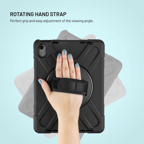 På baksidan finns ett praktiskt roterande handtag, vilket gör det mycket enklare att hantera surfplattan. Handtaget kan roteras 360 grader, så att du enkelt kan justera det till vilken position som helst, och kardborrebandet kan användas för att anpassa handtagsremmen till vilken handstorlek som helst. Handtaget fungerar också som en praktisk ställning - bara fäll ut det så placeras surfplattan stabilt i horisontell position, vilket är idealiskt för att titta på videor, videosamtal och arbeta på språng.