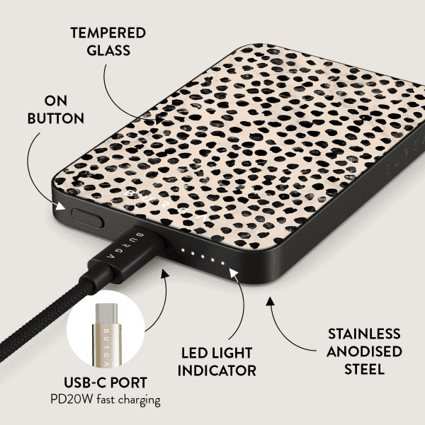 Möt den perfekta blandningen av mode och funktion. Detta eleganta kraftpaket på 5000 mAh håller dina enheter laddade och ger en touch av stil med BURGAs unika, blekningssäkra design. Det är mer än bara en powerbank; det är en statement piece som ger dina enheter ström när som helst, var som helst.