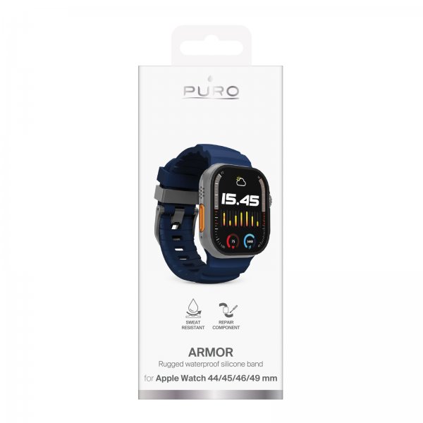 Puro Apple Watch 44/45/46/Ultra 49mm Armband Armor Blå är ett blått armband till Apple Apple Watch 44mm, Apple Apple Watch 45mm, Apple Apple Watch Ultra 49mm och Apple Apple Watch 46mm.