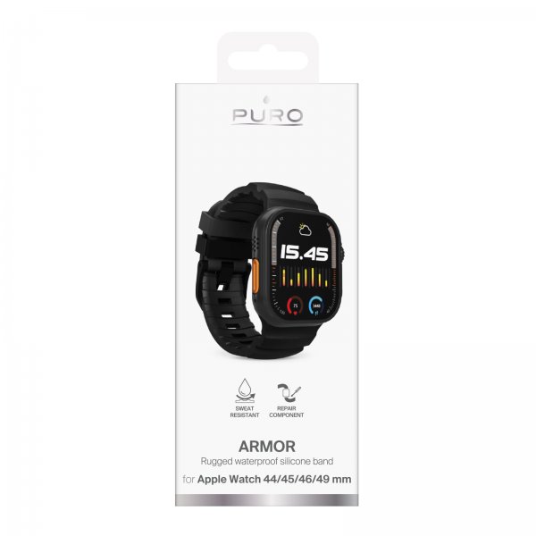 Puro Apple Watch 44/45/46/Ultra 49mm Armband Armor Svart är ett svart armband till Apple Apple Watch 44mm, Apple Apple Watch 45mm, Apple Apple Watch Ultra 49mm och Apple Apple Watch 46mm.