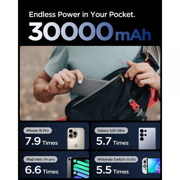 Powerbank med en kapacitet av 30 000mAh och 30W snabbladdning ger tillräckligt med kraft för flera dagars användning. Tack vare tre portar kan du ladda flera enheter samtidigt. Paketet innehåller en 1m USB-C till USB-C-kabel och ett skyddande foder.